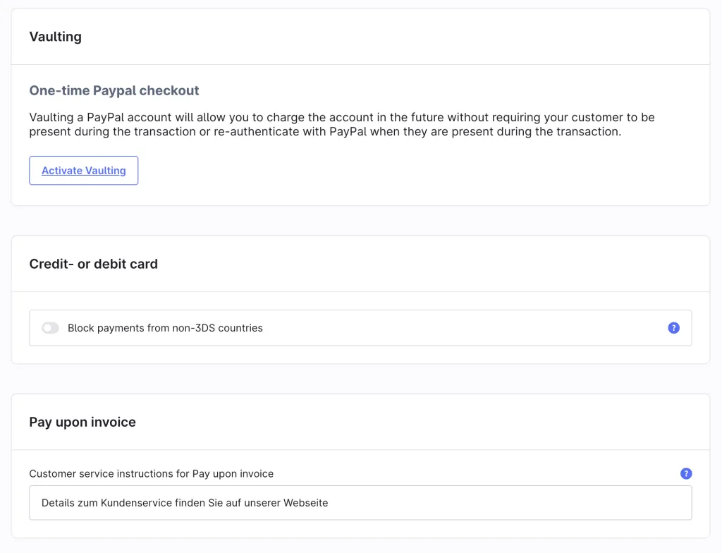 - Vaulting (Gespeicherte Zahlungsmittel): Kunden können ihre Zahlungsdaten sicher für zukünftige Einkäufe hinterlegen, was die Conversion-Rate bei Stammkunden erhöht.