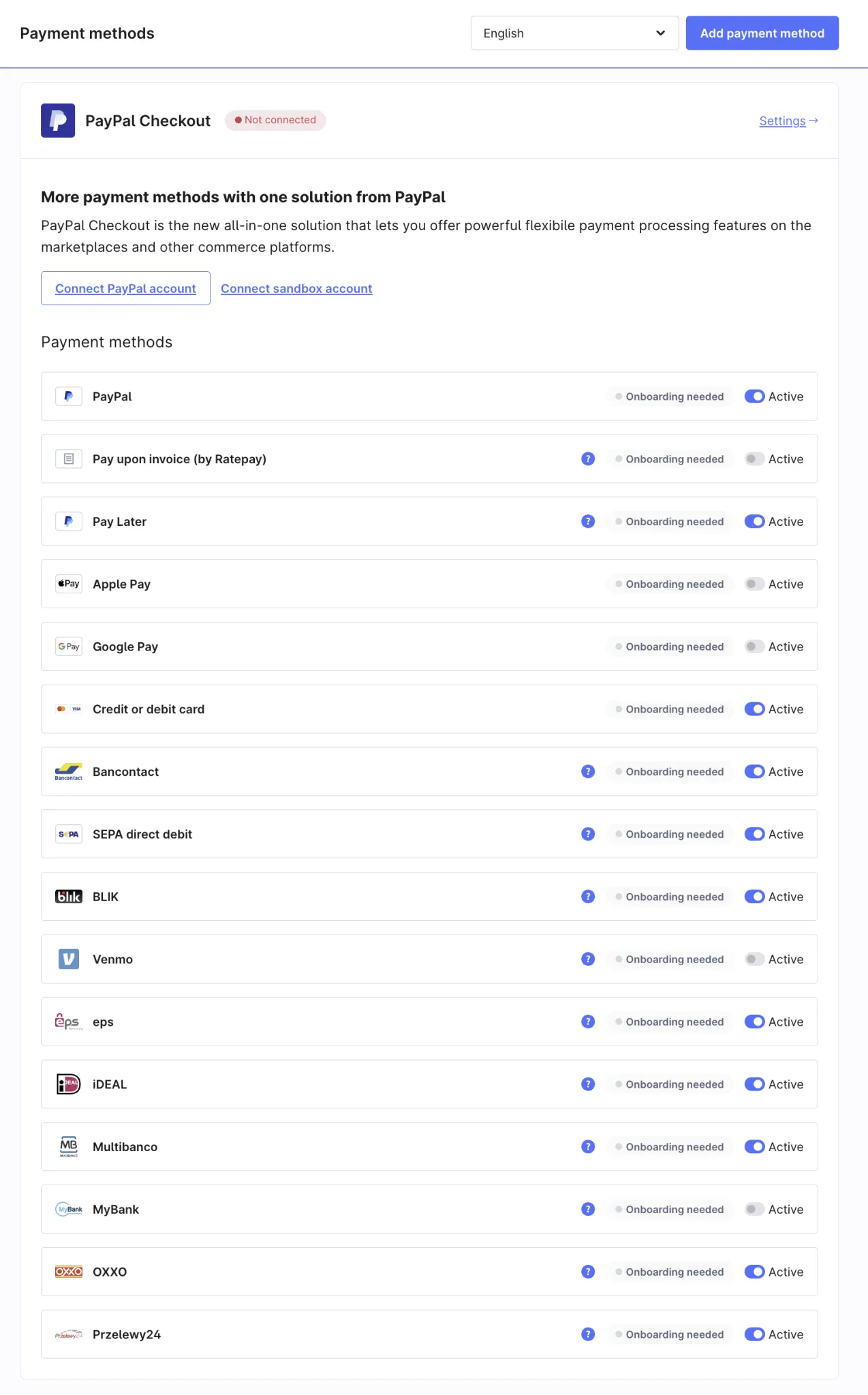 - Kredit- und Debitkarten: Direkte Akzeptanz von Visa, Mastercard und weiteren Anbietern, ohne dass der Kunde ein PayPal-Konto benötigt.