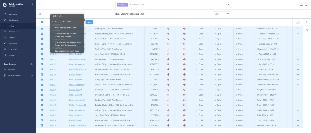 The plugin integrates seamlessly into the Shopware administration panel and extends the standard order list with bulk actions. Administrators and staff can select multiple orders and apply actions such as status updates, document generation, or PDF export with a single click.